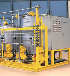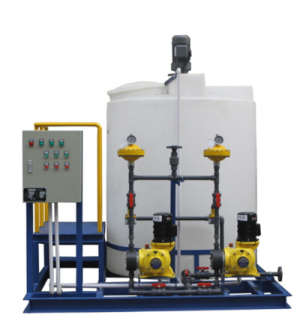 循環(huán)冷卻水加藥系統(tǒng),根據(jù)循環(huán)冷卻水的濃縮倍數(shù),通過電導(dǎo)率儀檢測循環(huán)冷卻的電導(dǎo)率(指標為水的含鹽量)達到一定數(shù)值后,控制電磁閥打開,循環(huán)冷卻水系統(tǒng)開始排放污水,在排放污水的同時向水中補加新鮮的水,同時向水中投加緩蝕阻垢劑(其投加濃度根據(jù)水質(zhì)和緩蝕阻垢劑的種類)。由于循環(huán)冷卻水的堿度偏高,可以通過自動加酸裝置調(diào)節(jié)其PH值。通過向水中比例投加殺菌滅藻劑,控制循環(huán)冷卻水的細菌和粘泥的增長。